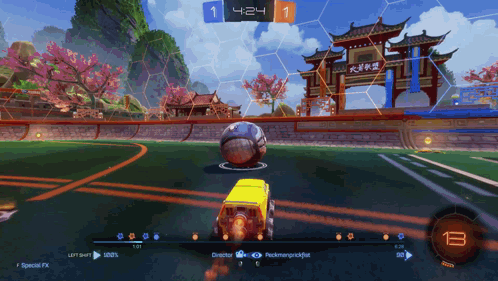 Content Description: a rocket league game is being played on a green field and the time is 4:24