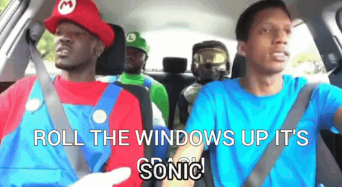 Content Description: a group of people in a car with the words roll the windows up it 's sonic written on the screen