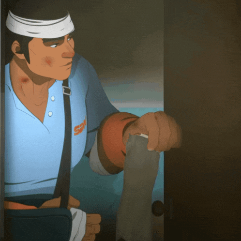 Content Description: a cartoon of a man with a bandage on his head and a shirt that says s on it