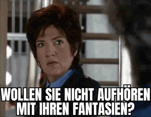 Content Description: a woman in a blue shirt is standing in front of a staircase and making a funny face with a caption .