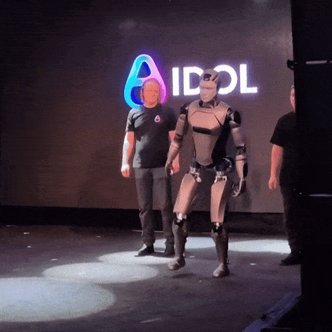 Content Description: a man in a black shirt stands next to a robot in front of an idol sign