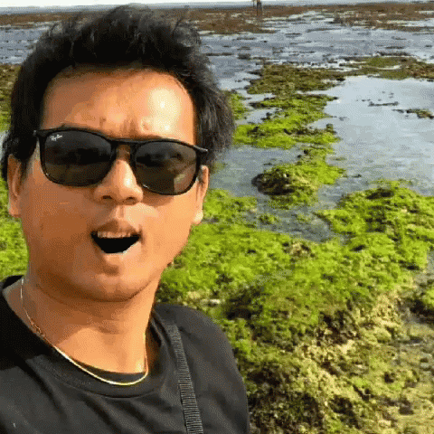 Content Description: a man wearing ray-ban sunglasses is standing in front of a body of water