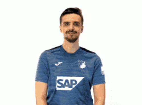 Content Description: a man wearing a blue shirt that says sap is holding a game controller