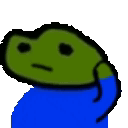 Content Description: a pixel art of a green frog wearing a blue shirt with a sad face .