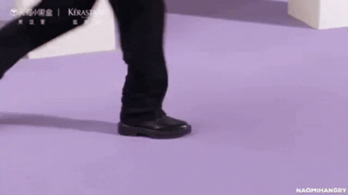 Content Description: a person wearing black shoes is walking on a purple floor .