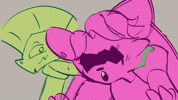 Content Description: a cartoon drawing of a pink raccoon and a yellow turtle .