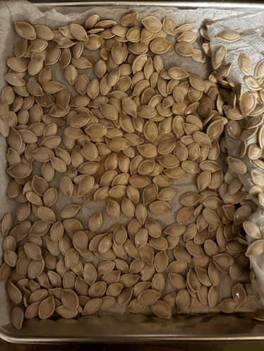 Content Description: a tray of pumpkin seeds sitting on a table