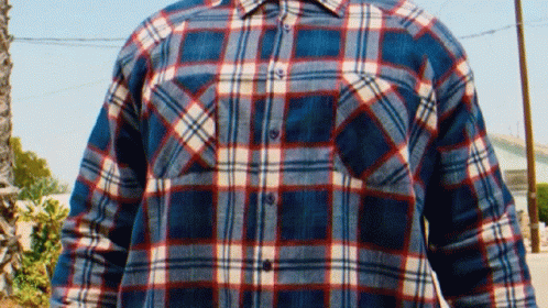 Content Description: a man wearing a blue and red plaid shirt is standing in front of a palm tree