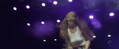 Content Description: a woman in a white top is dancing on a stage with purple lights