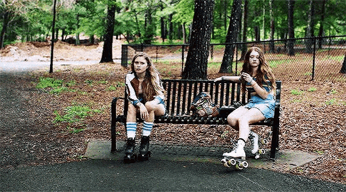 Content Description: two girls are sitting on a bench in a park with roller skates .