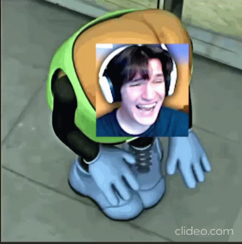 Content Description: a cartoon character with a picture of a man on his head and headphones .