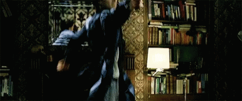 Content Description: a man in a blue jacket is holding a gun in a room with a bookshelf .