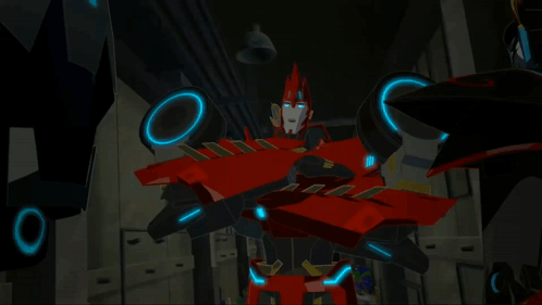 Content Description: a cartoon character with a red and black body and a blue circle around his head