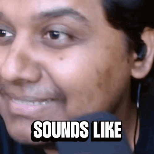 Content Description: a close up of a person 's face with the words `` sounds like '' written on it .