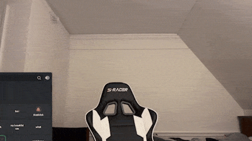 Content Description: a black and white s-racer gaming chair in front of a computer screen