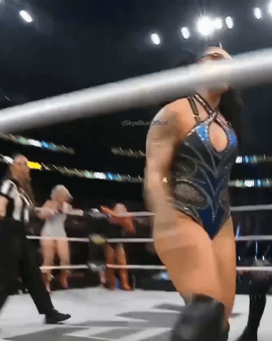 Content Description: a woman in a wrestling ring with the words skyeblue official written on the bottom