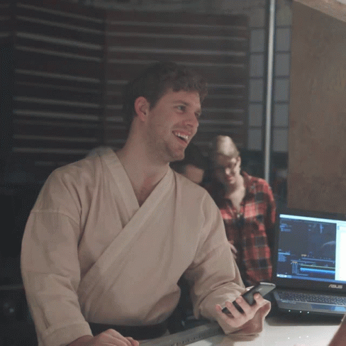 Content Description: a man in a kimono holds a cell phone in front of a laptop