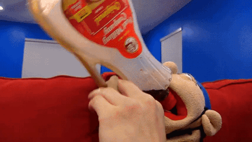 Content Description: a person pouring ketchup into a stuffed animal on a red couch