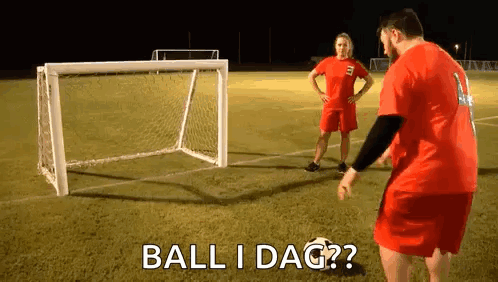 Content Description: a man and a woman are playing soccer on a field and the man is asking the woman if the ball is in the goal .