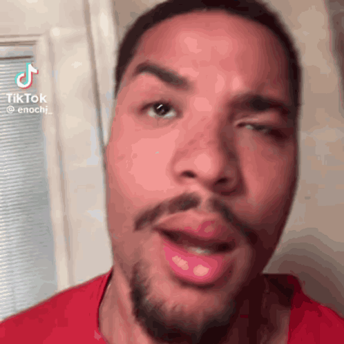 Content Description: a close up of a man 's face with a beard and a red shirt .