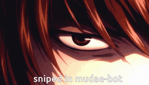 Content Description: a close up of a person 's eye with the words sniped in mudae-bot written below it