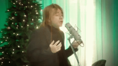 Content Description: a man is singing into a microphone in front of a christmas tree in a room .