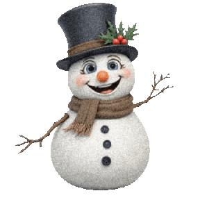 Content Description: a snowman wearing a top hat and scarf smiles for the camera