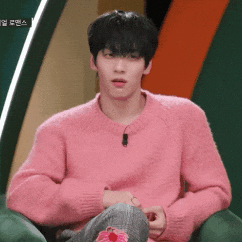 Content Description: a man in a pink sweater is sitting on a chair