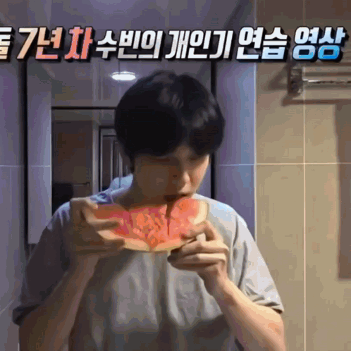 Content Description: a man is eating a watermelon in front of a wall with chinese writing