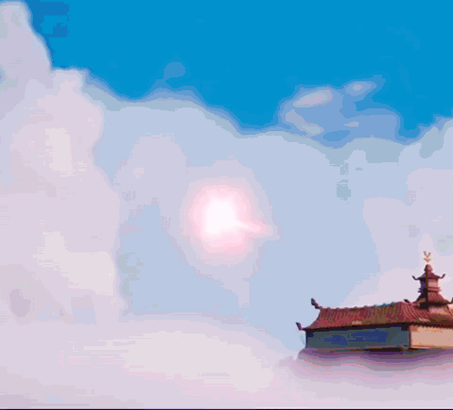 Content Description: a painting of a lightning strike with a chinese building in the foreground