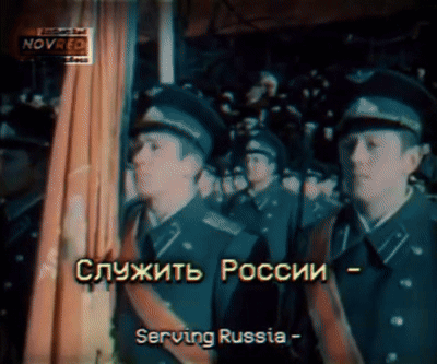 Content Description: a group of soldiers marching in a line with the words serving russia
