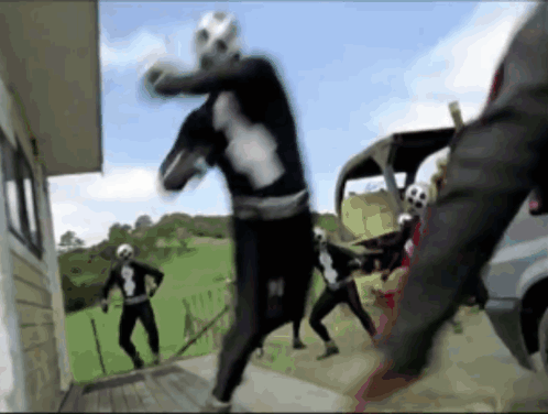 Content Description: a group of people in superhero costumes are standing outside of a building