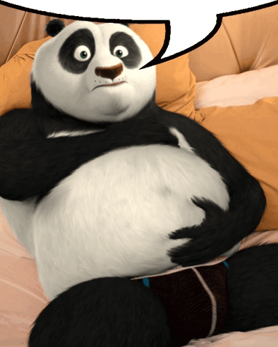 Content Description: a panda bear is laying on a bed with a speech bubble above it