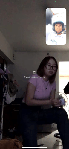 Content Description: a girl is sitting in front of a phone screen that says trying to reconnect
