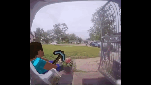 Content Description: a minecraft character is sitting on a porch holding a diamond pickaxe
