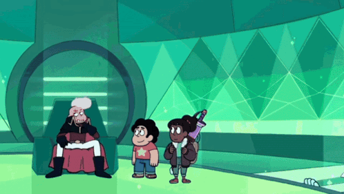 - Content Description: two cartoon characters are standing next to each other in a room with a green background