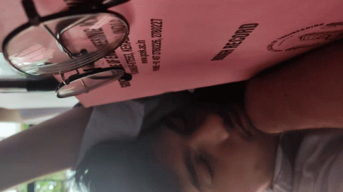 Content Description: a person wearing glasses laying on top of a pink paper that says ' birth record '