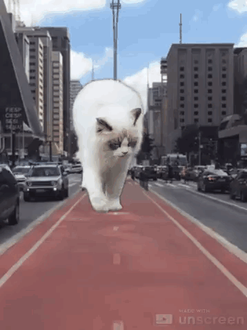 Content Description: a giant white cat is walking down a red bike lane in a city .