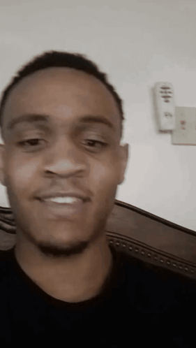 Content Description: a man in a black shirt is smiling with a remote control hanging on the wall behind him