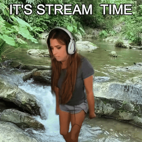 Content Description: a woman wearing headphones is standing in a stream with the words it 's stream time behind her