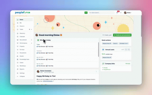 Content Description: a screenshot of a peopleforce website shows a message to eloise