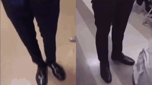 Content Description: a couple of men standing next to each other on a floor wearing black shoes .