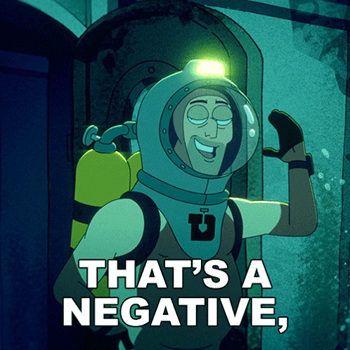 Content Description: a cartoon character says that 's a negative in white letters