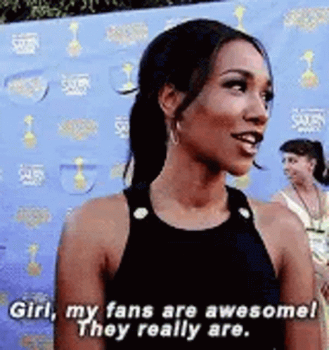 Content Description: a woman is standing in front of a blue wall and saying `` girl , my fans are awesome ! they really are . ``