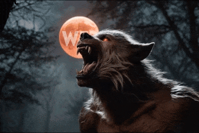 Content Description: a werewolf with its mouth open looks up at the moon with the letter w on it