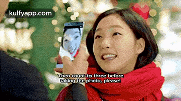 Content Description: a woman is taking a picture of herself with a cell phone and says then count to three before taking the photo , please !