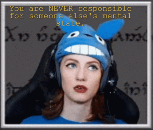 Content Description: a woman wearing a blue hat that says you are never responsible for someone else 's mental state ..