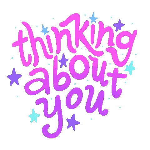 Content Description: a sticker that says `` thinking about you '' with stars and bubbles