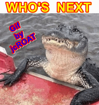 Content Description: a picture of an alligator in a boat with the words who 's next above it