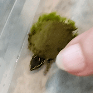 tiny baby turtle swimming next to finger for scale musk turtle algae